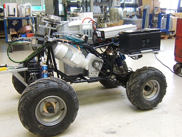 Dieser Mess-Fahrroboter transportiert einen hochauflösenden GPS-Empfänger und einen frei programmierbaren Rechner zur Steuerung und zur Datenspeicherung.